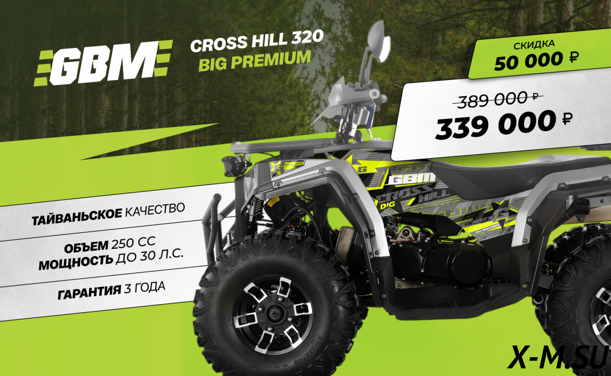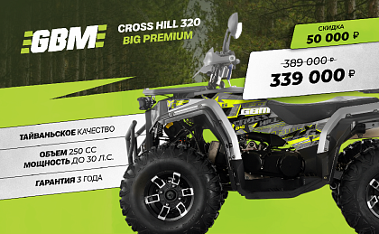 Квадроцикл GBM CROSS HILL 320 BIG PREMIUM — это один из самых надёжных аппаратов, которые я видел. Тайваньское качество на уровне японской техники. Крутящий момент двигателя передаёться на задние колёса при помощи цепи SFR, которая считается одной из самых крепких. Амортизаторы на передних колёсах и моно-амортизатор на заднем маятнике регулируемые и мощные. Всё это делает его отличным выбором для тех, кто хочет получить максимум удовольствия от езды по пересечённой местности. Плюсом также является гарантия 3 года, что редкость для подобной техники.